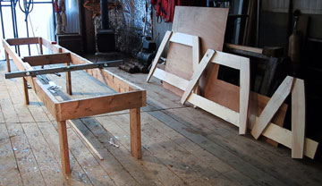 Today the old skiff was taken off of the saw horses and braces holding it level and moved outside onto it's trailer. The strongback that Rick built the day before was brought into the same space. It was centered over the batton with station measurements on it and leveled across the beam. Using two levels and a large square we brought the stem and transom points up from the batton on the floor to the strongback. Moulds 6 and 8 were place toward the bow before the station lines, and 2 and 4 were placed behind the station lines toward the transom.