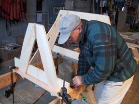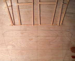 Rick made a pattern of the transom using small strips of wood and hot glue. He put that down on a sheet of 1/4' plywood and measured out at specific locations to recreate the shape. A profile guage was used to pick up the rounded shape of the corners of the transom at the sheer. It was used as a guide to draw a pencil line of the shape, and a tick strip was bent into that curve to sharpen the shape.