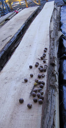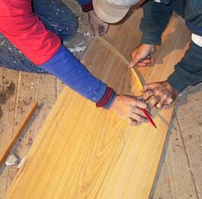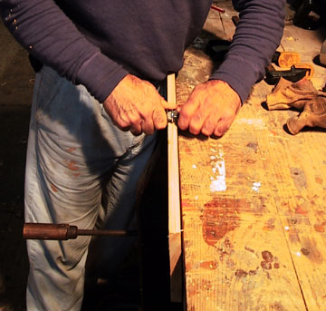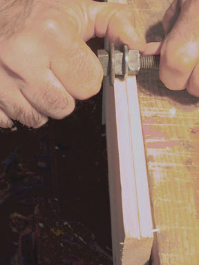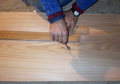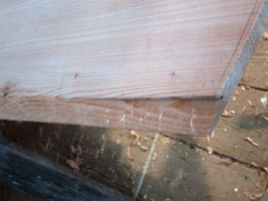 A small impression was forced into the thickness edge of each board, then it was planed down leaving just a small amount of that groove. When the board swells with water this groove will give a space for expansion so that the bottom boards won't be too tight.