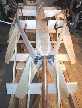 By Rick's suggestion we took the shape of the sheerstrake off of the boat by holding an uncut piece of cedar against the boat while scribing lines from the inside at the molds, stem and transom. Cut and fit and then used this plank as pattern for the other side. Both planks were clamped onto garboard at lap.