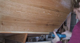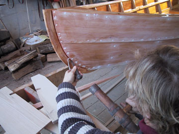 Finally a visitor! Jane came for the week and is helping me with the painting and varnishing which is coming along nicely. Each day I do a little something, like varnish the interior or the bottom with me painting above my head so that the paint doesn't run into the space between the bottom boards. That would impare the swelling necessary to float the boat.