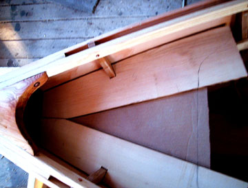 Before varnishing the rails I planed and sanded the top of the sheer where rails, planks, frames and knees all come together. I remembered that on my other boat, the Trumpy Tender, I had taken the corners off of the top of the frames to avoid chipping of the sharp corner, so I did the same on the skiff. Here is a picture of before and after that little chore: