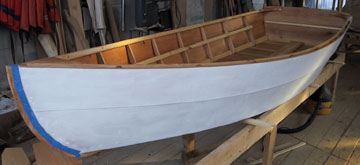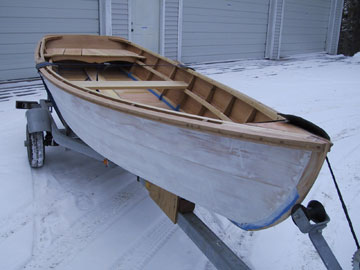 Moved the skiff to a heated shop, 55 degrees, so that the paint will dry in a timely manner. This will free up space for the next boat to get started, a second Mathis skiff, and won't restrict the sanding that is necessary in Rick's shop. Started to paint!